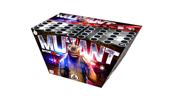 Klasek Mutant, fette 64 Schuss Feuerwerksbatterie mit bunten Effekten im Kaliber 30mm. Die Batterie wird in Z-Shape geschossen und hat ein Abschlussfinale als Salve.